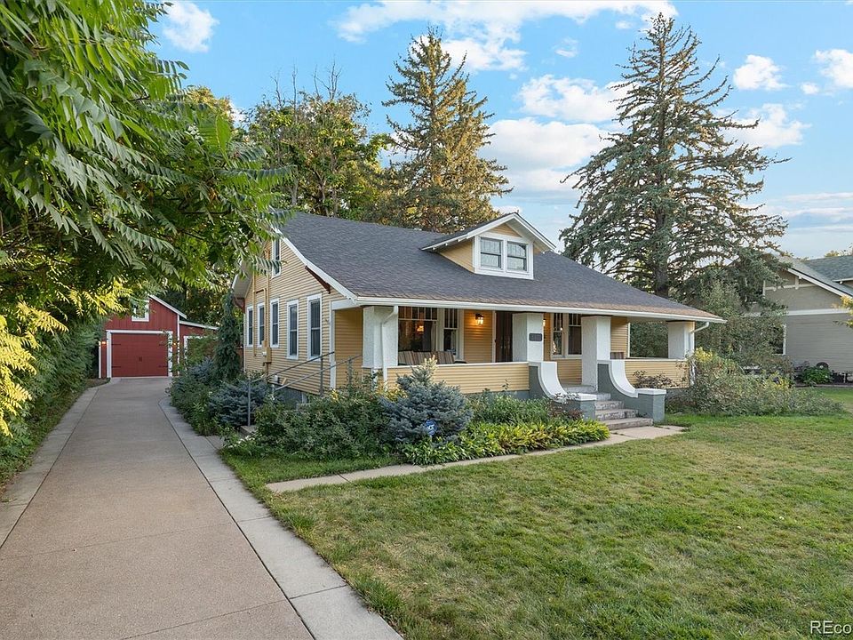 Located in the Stocke-Walter Addition Historic District, this captivating property sits on an incredible 1/2 acre lot just minutes from vibrant, Olde Town Arvada! A seamless blend of historic farmhouse charm and modern updates, this rare offering is an opportunity not to be missed. Truly an oasis in the city, the property has been lovingly restored and renovated inside and out! As you enter the home, you are greeted by the warmth of original wood details, adding character and nostalgia to every corner. The spacious, open kitchen is a chef's dream, with a new dual-fuel range, ample cabinet space, and stunning quartz countertops. Large windows fill the interior with light and frame the views of the beautiful lot. This home features three bedrooms: a charming bedroom with a new full bath upstairs, a convenient main-level bedroom and full bath, and a bright and functional finished basement well-suited for a bedroom, office, or other needs. Updates to this home are extensive, notably a high-efficiency furnace and high-efficiency water heater (2021), a radon mitigation system, a newer roof (2017), newer exterior paint (2021), and an oversized garage that is a mechanics/hobbyist dream! Reminiscent of a classic barn, it provides visual charm and functionality with 7' and 8' overhead bay doors. The side barn doors can even be opened to the yard to transform it into an indoor/outdoor entertainment haven. Beyond the barn, you'll discover the rest of the half-acre lot bursting with fruit trees, rows of grape vines suitable for winemaking, and vegetable gardens. The possibilities are endless if you've ever dreamt of having a hobby farm! This sale includes valuable shares of irrigation water rights through Wadsworth Ditch Company, providing a water supply to the spacious lot. Don't miss the video tour of the lot in full bloom!! https://vimeo.com/864872035