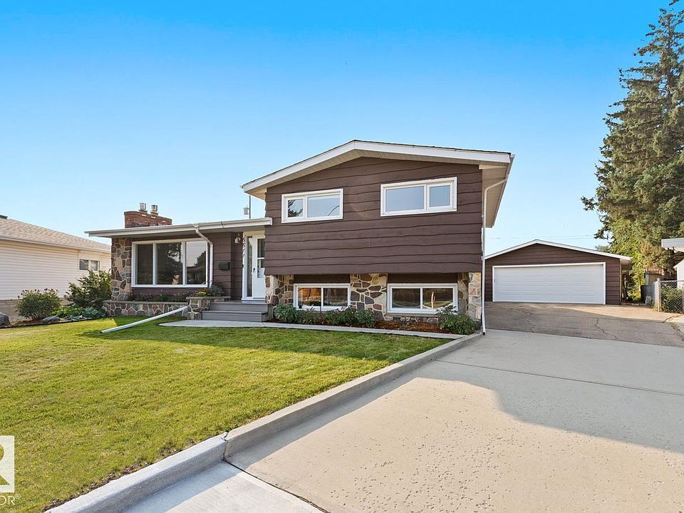 A RARE city find: A fully renovated mid-century character home paired with a MASSIVE, OVERSIZED 23.5x45, garage with new floor sitting on a 991m2 lot featuring AC, 4 bedrooms & 2 baths. A bright, spacious entry welcomes you with vinyl plank flooring, vaulted open-beam ceilings, & a cozy fireplace in the living and dining rooms. The kitchen looks straight out of a magazine with two-tone cabinetry, corian countertops & S/S appliances. Upstairs offers a king-sized primary, 2 additional bedrooms & a stunning 5pc bath. The lower level features a stylish family room with herringbone flooring, 4th bedroom, modern 3pc bath & laundry. The unfinished basement provides ample storage or future development. Outside, enjoy the fenced, landscaped yard with a covered patio & access to the massive garage, all on a 991 m² lot just steps from parks, trails, schools & shopping in desirable Ottewell. Major updates include electrical panel & wiring, plumbing, windows & HE furnace. Nothing to do but move in!