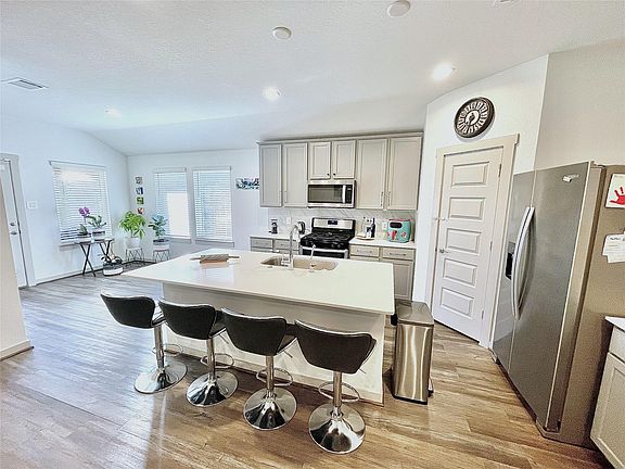 Step into this lovely one-story home offering a smart, modern floor plan with 3 bedrooms and 2 full bathrooms. The open living area flows effortlessly into the gourmet kitchen boasting quartz countertops, a large eat-in island and stainless steel appliances. Beautiful vinyl wood-plank flooring throughout bring a fresh feel, while plush carpeting in the bedrooms offers comfort and warmth. The private primary suite features a walk-in closet and a bathroom with dual sinks and tiled shower. The garage has been upgraded with full insulation and air conditioning, allowing it to be used year-round as a multipurpose room, home gym, or workshop. It can be easily restore for traditional vehicle parking. Outside, enjoy the covered patio for entertaining and take peace of mind in a home designed with energy-efficient features such as tankless water heater and smart-home technology.