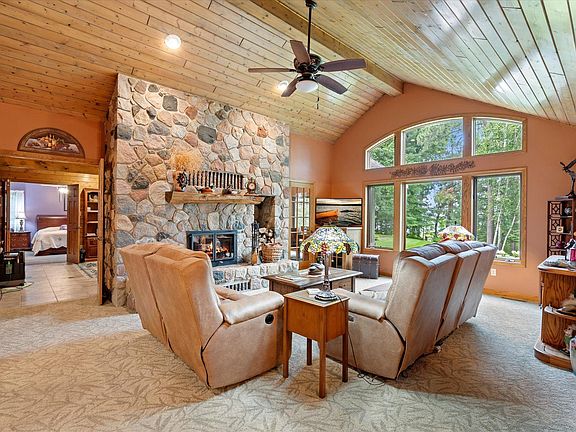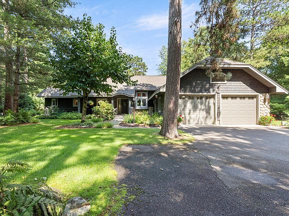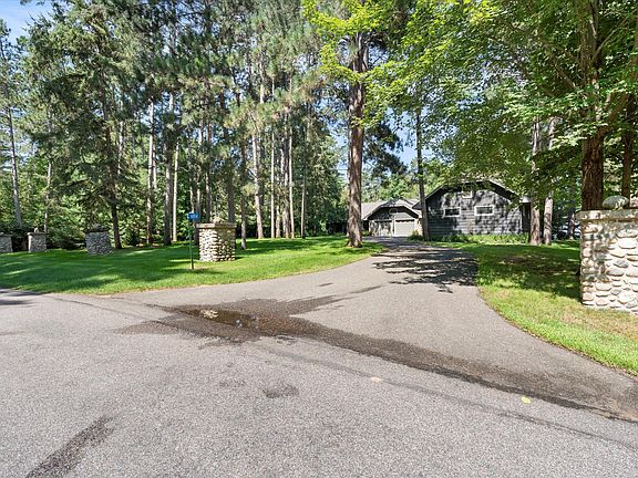 Beautiful Whitefish Chain estate style property creates a setting of privacy framed by mature pine trees and a northwest view of Upper Whitefish Lake. A unique combination that is characterized by a focus on comfortable lake living, this 4 bedroom, 3 bath home includes 3600 finished sq. ft. of living space and is set on a lot that has approximately 190 feet of shoreline on Upper Whitefish Lake and almost an acre of land. The home showcases exceptional interior appointments such as a spacious living room with vaulted wood ceiling and real stone wood-burning fireplace, gourmet kitchen with custom cabinets, hardwood floors, dining area, office, private primary suite, 4 season porch, 2nd bedroom and a main floor laundry room. The fully finished lower level features a family room with a gas fireplace, bar area, game room, 2 bedrooms, 1 bath and a storage room. There is plenty of room for cars and storage with the attached 2 car garage and detached 3 stall garage that has a ½ bath and workshop area. The immaculate grounds feature in-ground sprinklers and have a manicured grass area with large boulder retaining walls, outside lakeside patio and roadside stone pillars. Enjoy the moderate elevation down to a level area on the lakeshore and a boathouse for additional storage.