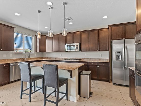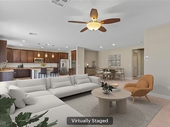 Beautifully Well-Maintained Single Story Home that offers a blend of comfort and style, nestled in Providence Master Plan Gated Community. Welcome guest into the Family room and dining area that boasts a comfortable inviting atmosphere. The family room is a great space to relax and get cozy while the kitchen has all your cooking essentials: SS Appliances, double oven, ample prepping space and large island to gather around and a walk-in pantry to store. You can enjoy the flexibility of a dedicated office space for remote work or double as a game room. The Primary bedroom is tucked away from the guest quarters with an en-suite bathroom and a walk in closet. The Den offers space for a playroom, cozy reading nook or can be turned into a 4th room. The guest rooms provide add'l living space and share a spacious guest bathroom. Step outside to a beautifully landscaped backyard designed for easy upkeep, providing ample space for outdoor entertainment, BBQ, or simply enjoy the Vegas Weather.
