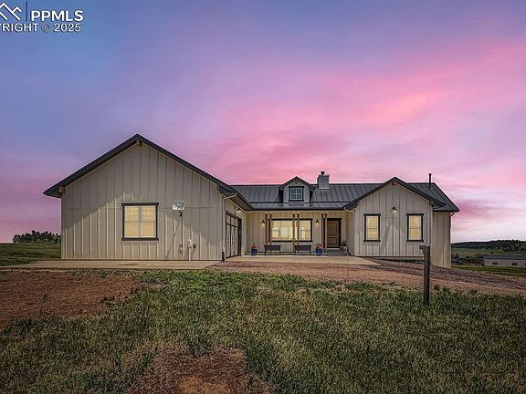 Colorado Springs custom built modern farmhouse with room to create, bring your horses if you desire! This 4-bedroom (5th bedroom or office), 3.5-bath home offers 4,072 sq ft, nestled on 5.59 private acres with views of Pikes Peak. Built in 2019, the home features a spacious living room, office, family room, and dedicated theatre room. Enjoy the convenience of a 2-car oversized attached garage with hot/cold water spigot, ceiling fans in the living spaces and bedrooms, and a generator transfer switch for peace of mind. The property includes a well, septic system, sump pump, propane gas, and zoned forced air heating with a direct vent gas fireplace. The professionally landscaped grounds boast a hot tub, covered front porch, covered upper deck, and covered back patio, along with an outdoor sprinkler/drip system. Additional features include a metal roof, board and batten siding, a basement storage area, and a loafing shed. Appliances include a gas oven/stove, gas water heater, 2 microwaves, 2 refrigerators, 2 dishwashers, and a washer/dryer. Three sides of the property are fully fenced. Don’t miss this rare opportunity to enjoy Colorado acreage living with modern amenities and room to roam!