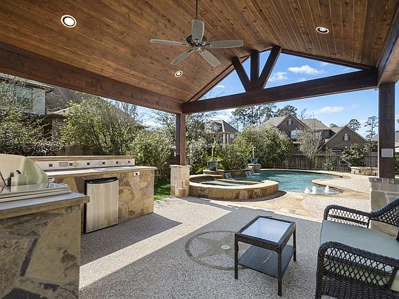 Enjoy vacation in your own backyard in this fabulous pool, outdoor living area & firepit! Travertine floors flow effortlessly on the first floor & so easy to maintain! The kitchen has a huge island, gorgeous granite, so many cabinets, gas cooking & double ovens. The stone fireplace in the family room is the focal point, as well as the view to the backyard paradise! And, speaking of paradise, the master suite is it! Complete with a sitting area & a bath that is to die for. Ah, just let that spa tub take me away! All bedrooms upstairs are spacious & there is a game room & media room that is perfect for movie night or sports! Wood steps with iron spindles adorn the staircase & is a show piece in the foyer...so pretty! The outdoor living area is the perfect spot to catch a sunset, & is complete with a Tepanyaki hibashi grill, gas grill & fridge. So much fun....and top it off with roasted marshmallows and s'mores at the firepit! Convenient to Creekside shopping & new dine in theater!