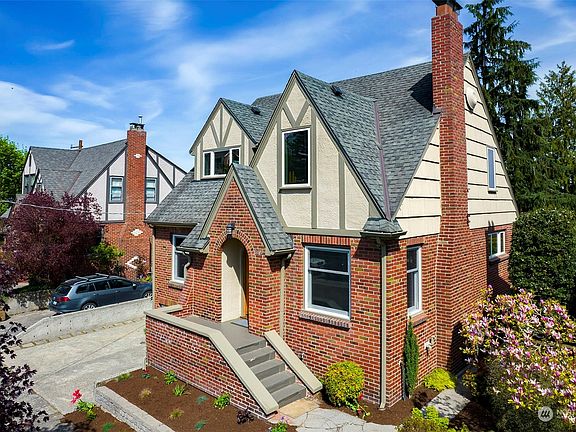 Fabulous Tudor style home in sought after Phinney Ridge location. Greenlake views. Spacious & extensively remodeled (2009) for modern day living - lake & Mt Rainier views. Wonderful layout with 3 bedrooms/ 1.75 baths on 2nd floor plus a 4th main floor bedroom. 1928 charm meets modern lifestyle: open floor plan, A/C & EV charging station. Hardwood floors. Entry. West facing living room. East facing kitchen & dining room with a fabulous wall of glass doors leading out to the oversized deck. Imagine summer here! Upstairs primary suite: Mt Rainier view, spa like bath w/ heated floors. Fantastic daylight lower level: large family room, office, rec-room & laundry room. Fully fenced yard. 2 off street parking spots. Walk score: 84 Bike score: 81