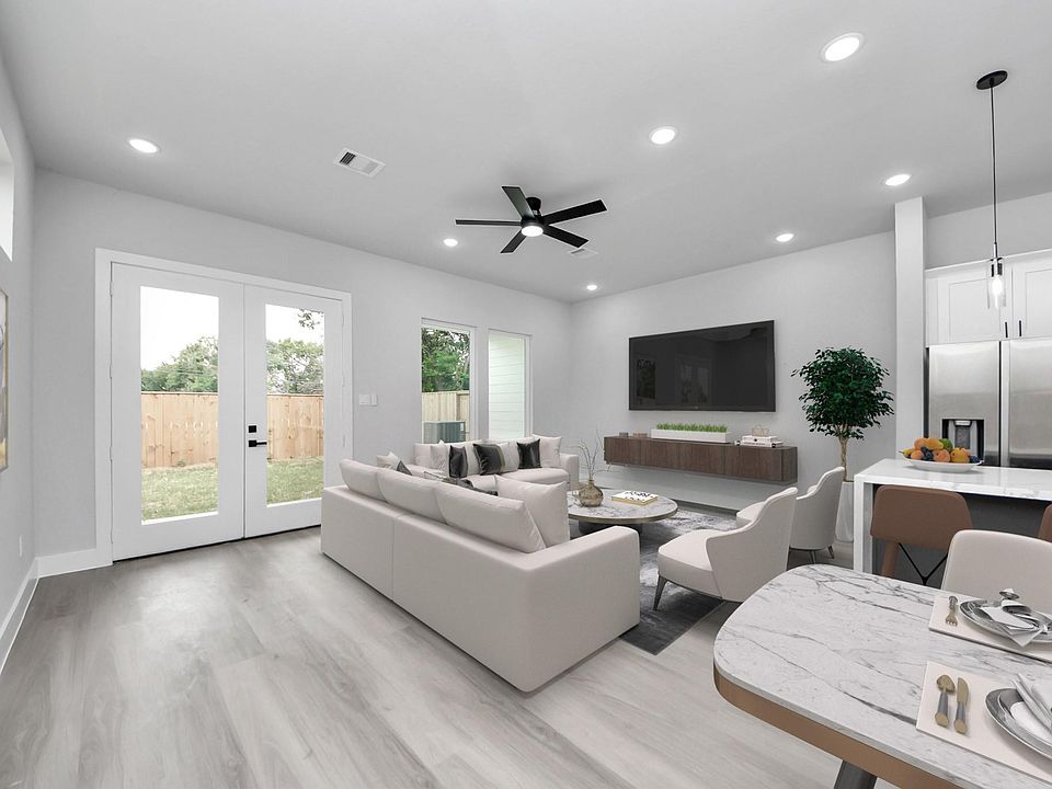 WELCOME TO DEL RIO PLACE — Modern. Urban. Timeless. This expertly crafted 2-story new construction home near the Houston Medical Center offers 2,018 sqft of thoughtfully designed living on a 2,575 sqft lot. Blending clean architectural lines with purposeful function, the open-concept 1st floor features durable LVP flooring, sleek quartz countertops, a full quartz backsplash, & contemporary cabinetry with soft-close hardware. Upstairs, 4 spacious bedrooms & 3 full baths include a serene primary suite with a freestanding soaking tub, oversized walk-in shower, expansive closet, & private balcony. Additional highlights include PEX plumbing, stainless steel appliances, a custom wrought iron entry gate, & a private driveway. The fully fenced backyard features fresh sod, French drains, rain gutters, & a spacious covered patio—ideal for entertaining. Located minutes from the Med Center, Hermann Park, Downtown, and the Galleria - this home is where modern design meets timeless location.