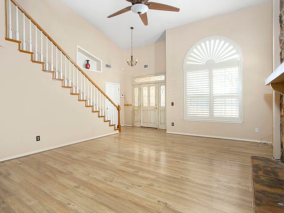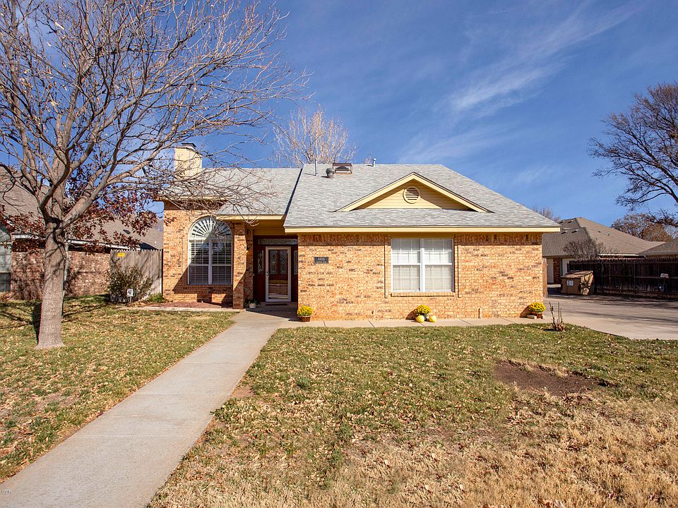 A great find in Estacado! This is a 3/2.5/2, two story home on a corner lot with a large, bright great room! Walk into vaulted ceilings, and the most eye-catching floor-to-ceiling stone fireplace that opens into the dining area and kitchen where there is an eat-in bar, light wood cabinets, multi-colored tile backsplash and a cute barn door that hides the utility room. The master bedroom is downstairs and truly isolated! It includes two walk-in closets plus an ensuite that features a giant walk-in shower and two sinks. Upstairs, you will find two more bedrooms, a full bathroom, and a huge loft that looks over the downstairs living room. The outdoor space is another great feature of this home! There is a covered pergola with a ceiling fan and string lights,