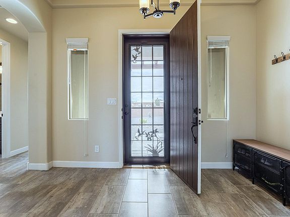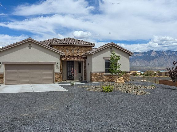 This Hakes Brothers home sits on a spacious 0.5-acre lot and showcases breathtaking, unobstructed views of the Sandia Mountains. The thoughtfully designed 2,357 sq. ft. floor plan offers 4 bedrooms, 3 baths, and a 2-car garage, blending comfort with modern elegance. High-end upgrades include a gourmet chef's kitchen, stylish upgraded tile in main living spaces and wet areas, soaring 8-foot doors, a sleek 36'' contemporary gas fireplace, and beautifully hand-textured walls. The fully walled lot provides ample space for a shop, RV, trailer, or toys, while the private, landscaped area features Synlawn & a covered patio--perfect for relaxation. The backyard has been leveled and is ready for your imagination--design the outdoor oasis you've always wanted. No HO