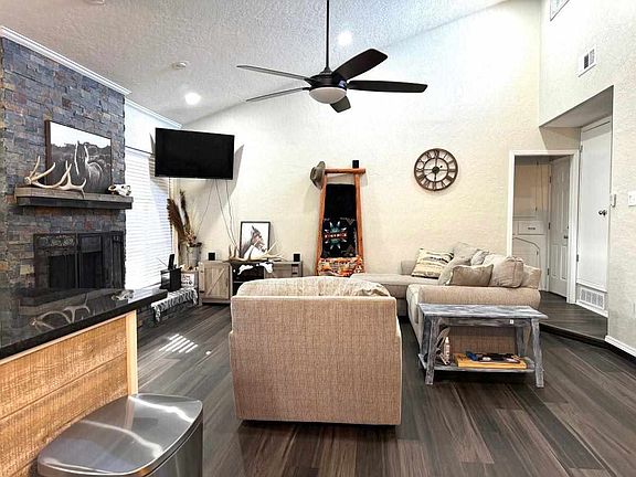 This 3 bedroom, 2 bath home is a looker! Great floor plan with vaulted ceiling, open kitchen-living with step down living adorned with a wood burning fireplace with gas start. Separate dining area and breakfast bar. Recently updated to include granite countertops in kitchen and bathrooms, flooring, both bathroom tile and tub surrounds upgraded, new roof and more. Large master bedroom. Good storage with big closets throughout. Stunning tile shower surrounds in both. Large patio to relax and enjoy the outdoors. Don't delay, you will miss out. Call Carla Weaver for a showing or video tour, 580-280-0715.