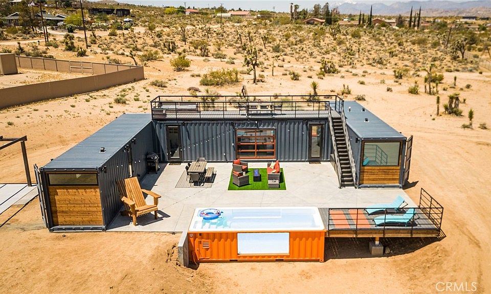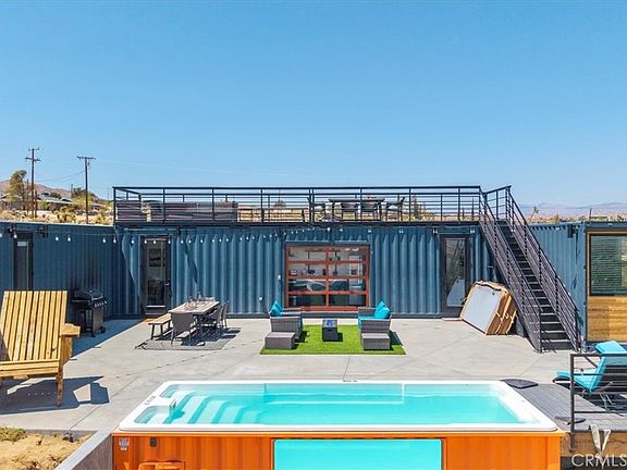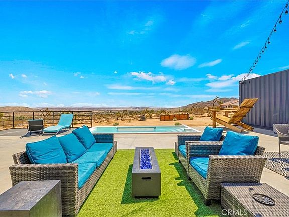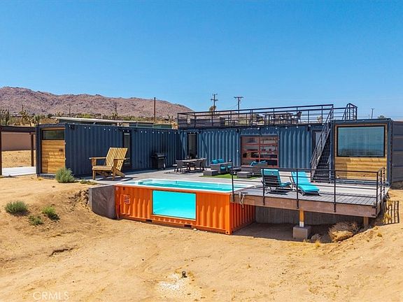 Welcome to 6816 Saddleback Rd, AKA Box on the Rox! A truly unique & ONE-OF-A-KIND fully-permitted Container POOL home located in the highly desirable town of Joshua Tree. This property is nicely situated on 1.25 acres of prime land complete with stunning desert & mountain views and is just minutes from downtown, the park entrance, shops, galleries, eateries & more. This 3 bedroom, 2 bath contemporary home was designed by renowned architect David Bailey and was built in 2022 with every feature intentionally chosen to bring you the perfect desert home, airbnb or weekend retreat. Complete with PAID SOLAR, 5 mini-splits (to keep you comfortable year round), a full size stackable washer & dryer, a large carport, EV Charger & a Fully Furnished Roof Top Deck! The kitchen includes full size stainless steel appliances & dining can be enjoyed both inside & out, compliments of the modern, electric roll-up door. The primary bedroom features an ensuite spa-like bathroom with 2 single sink vanities, an oversized walk-in shower with 2 rainfall shower-heads and a soaking tub for full relaxation. The additional bathroom also adorns a walk-in shower with a rainfall shower-head and all 3 bedrooms include queen size memory-foam mattresses and picture windows that let in an abundance of natural light. Outside is truly an entertainers dream, from the private Roof Top Deck to the awe-inspiring Pool (which can be adjusted to also be used as a hot-rub), it's truly the perfect place to unwind in nature but with the added bonus of modern comfort and convenience. This home is also being sold Fully Furnished! A property like this rarely becomes available, come take a look & let it's charming allure do the rest. Your new desert home, investment property or weekend retreat awaits!
