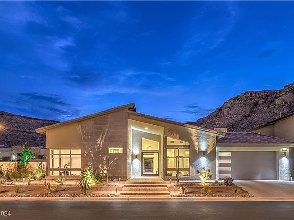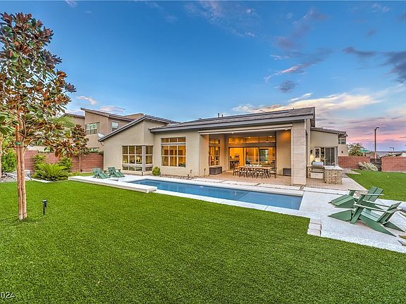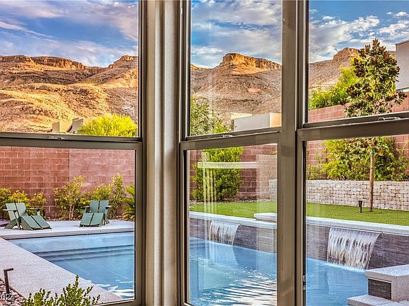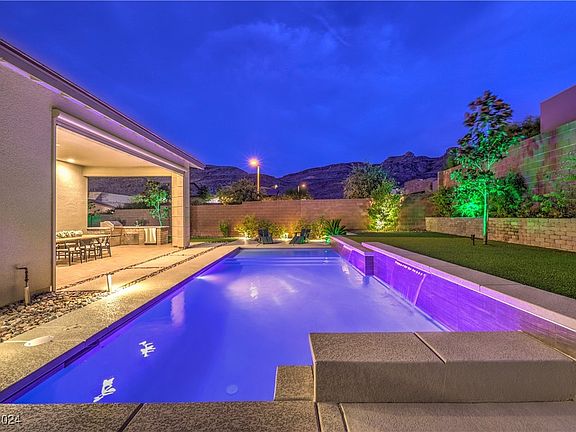 Stunning single-story modern luxury in South Summerlin with mountain views from every window. This 3,275 sq ft oasis features 4 bedrooms, a den, a formal dining area, and a resort-style backyard with a pool, waterfalls, BBQ, artificial turf, and auto solar shades on a private 12,632 sq ft corner lot. Enter through the custom glass pivot door to an open floor plan with high ceilings, upgraded tile and wood flooring, and expansive windows with maximum natural lighting. The living room has multi-stacked sliders, an elegant bar, and a den with built-in shelves for seamless indoor-outdoor entertaining. The kitchen boasts a 11 ft quartz island, Thermador fridge, blue pendants, wine fridge, walk-in pantry, and 2 dishwashers. Oversized primary suite offers extra large windows, a spa-like tub and shower, and custom closets. Located in the quiet gated community of Nova Ridge, enjoy a park, hiking trails, and proximity to Bishop Gorman High School, Downtown Summerlin, and Durango Station Casino.