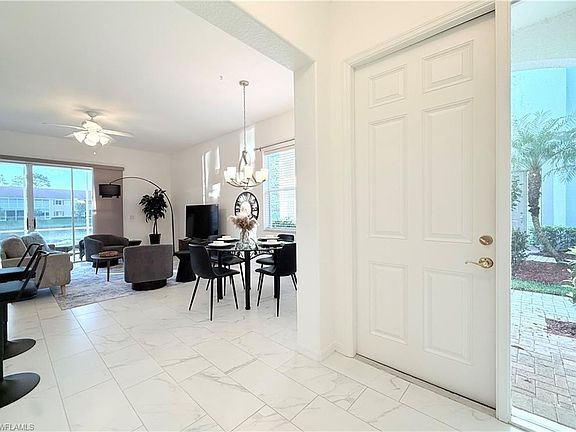NOW AVAILABLE ... Beautiful GROUND FLOOR, 3BR (can be used as 2BR + Den), 2 Bath Condo w/ Garage in Glen Eagle. Social Membership is deeded with property. This exceptionally well cared home is move in ready. Upon entry you will notice an abundance of natural light and newer tile flooring throughout the home. Kitchen has easy to care from corian counter tops, breakfast bar, pantry, ss appliances and light wood tone cabinets. Refrigerator and Range are 1 year old. Very spacious primary bedroom with two large closets. En suite has dual sink vanity, separate shower and tub, private water closet and linen closet. Primary shower has been updated with custom tile and frameless shower door and wall. Primary bedroom is split from guest bedrooms for added privacy. 3rd bedroom is off main living area and can be used as a den or home office if preferred. Guest bath has updated custom tiled shower. Living room opens to back lanai where you'll enjoy relaxing with view of water and sunsets. Glen Eagle offers its residents an 18 hole golf course, clubhouse with indoor and outdoor dining options, fitness center, tennis courts, pickleball courts, indoor golf simulator, community pool and bocce ball. With a very active social calendar you will always have activities to enjoy. Note: While property does not have deeded golf membership, the social membership allows you to golf May thru October. Glen Eagle is located just minutes for downtown Naples and beaches.