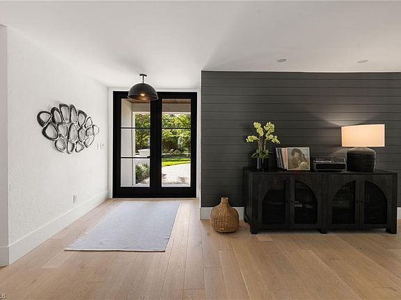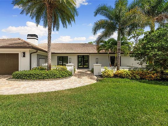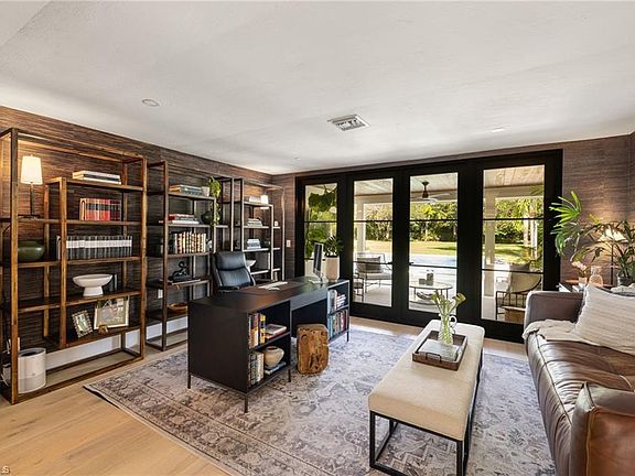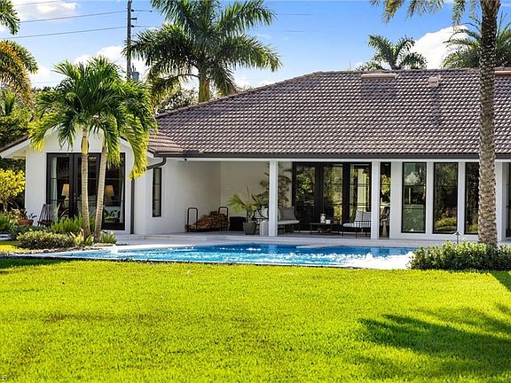 This updated estate home is nestled on 1.63 acres of beautifully manicured grounds, offering unmatched privacy and serenity in the heart of North Naples. X Flood Zone. One of the highest points in Naples, 17 FEET HIGH! Behind the gates, you will see a hard to find 5 bedroom 5.5 bath home sprawling 3800 sq/ft. Wide-plank French oak flooring flows throughout the home, adding warmth and sophistication. The primary suite is a private sun-filled retreat that opens through French doors to its own patio. The outdoor living is elevated with a fully reimagined lanai and pool and spa area, lush tropical landscaping, and even a batting cage—the perfect blend of relaxation and recreation. Plenty of room for an addition or guest house. The climate-controlled garage features a new mini-split system and epoxy flooring (2024). Recent upgrades include: Andersen impact doors & windows (2020), additional mudroom, tankless hot water heater, newer HVAC and plumbing systems (2023) New electrical panels (2023) City water connection. Located within walking distance of Waterside Shops and just minutes from Mercato, the beach, and downtown Naples, this property combines luxury, privacy, and an unbeatable location—creating a true North Naples oasis.
