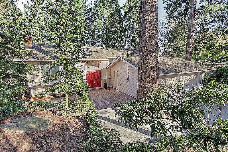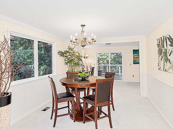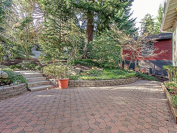 Lots of room in this livable home. Eat-in kitchen has slab granite, custom cherry cabinets, Dacor, Bosch & and tumbled tile. Neutral colors, vaulted ceilings and skylights. Separate dining room. Two baths updated. Custom built-ins in huge rec rm. Storybook landscaping on quiet street. Wired for generator. Waterproof top deck runs house length & protected bottom deck lets you enjoy the outdoors, whatever the weather. Large lower bedroom was once 2 bedrooms; could be again. Loads of storage.