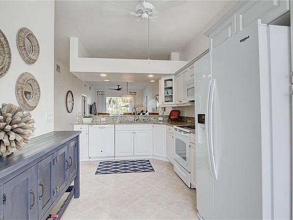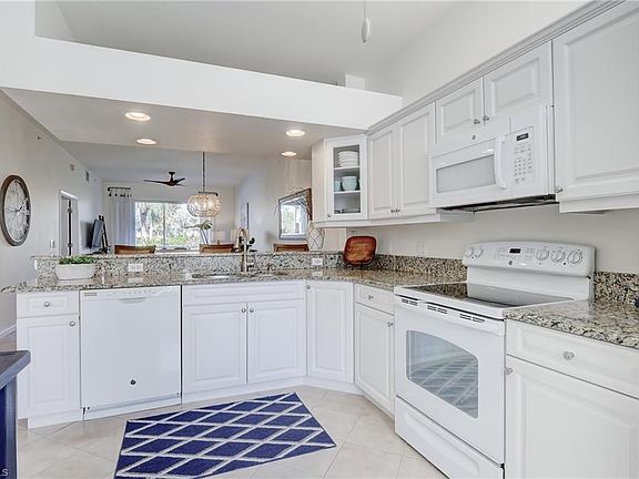 Welcome to Paradise! Convenient to both Marco Island and Downtown Naples this highly sought after 1st floor unit has spectacular views of the ponds and tropical landscaping from its 300 sq ft screened in lanai. This bright and airy costal 2 BD/2 BA home has flowing natural light, 9 1/2 ft ceilings & neutral tile floors throughout. Updated kitchen has white cabinets with granite countertops and breakfast bar for extra seating. Large primary bedroom, bath with duel sinks, sizeable walk in closet and patio slider to lanai where you can sit and enjoy your morning coffee as the sun rises. The detached garage provides ample storage with extra cabinets and shelving for all the beach toys.FWBR is a friendly, socially active community with its 600 ft Lazy River Resort Style Pool, along with Tennis, Pickle Ball, Bocce Courts, lap pool, biking, walking paths, and many in-season activities. There's something for everyone! This unit is located in Phase 4, which is the only phase to allow the owner 1 dog of any size.New Roof and Gutters 2022.Plus, the lenient rental policy, which allows 12 rentals per year, with a 30 day min. makes for a great investment opportunity. TRULY, A PIECE OF PARADISE!