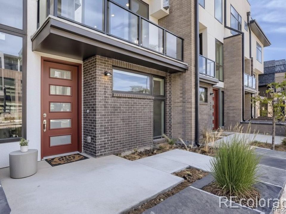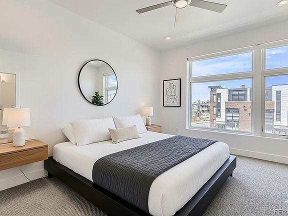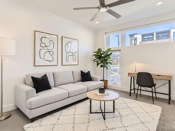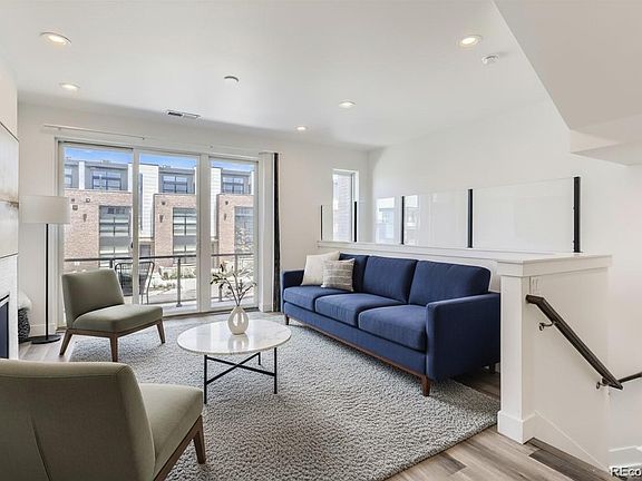The main living area has an easy rhythm. The kitchen sits at the center — white shaker cabinets, quartz counters, and a large island that naturally draws people in. The dining and living spaces flow together, anchored by a fireplace and a west-facing balcony that catches Denver’s evening light.