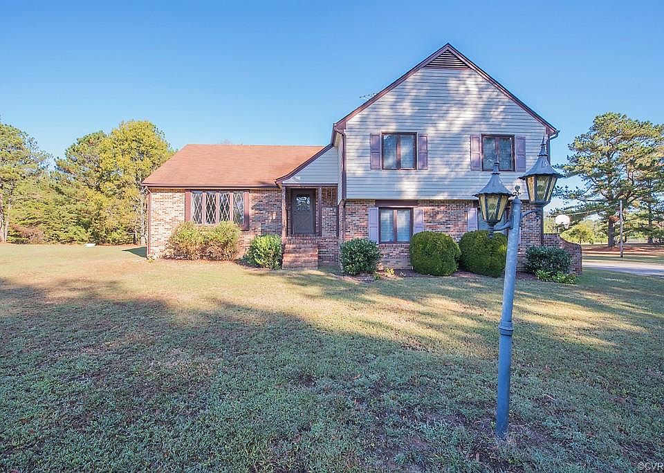 This great Tri-level in Prince George is on 5 acres just 10 minutes from the back gate of Fort Lee and 15 minutes from Colonial Heights and 5 minutes from the schools in this district. This home has an updated Kitchen with custom cabinets, silestone counter tops and tile backsplash. The Living and Dining rooms have gorgeous hardwood floors and crown moulding. The Dining room also has chair railing. The Master bath is being renovated with ceramic tile floor and shower. The Family room has a brick fireplace and the extra large Rec room has a huge brick hearth, beamed ceiling, wet bar and pool table. There is a storage shed in the back yard and a 2 bay tractor/equipment shed.