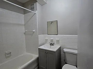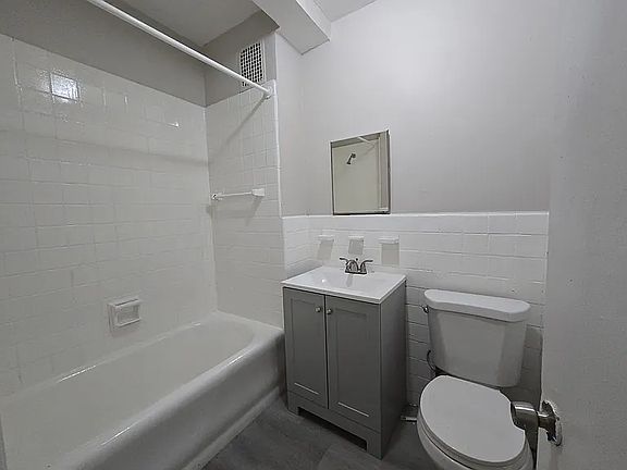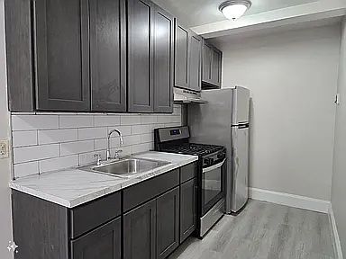 This recently renovated apartment blends modern upgrades with a touch of classic architectural detail, making it highly attractive to renters. The entire unit features brand new gray plank flooring and is freshly painted in a pleasing light gray, providing a contemporary, clean canvas. The living area is especially charming, showcasing attractive decorative wall molding and large windows that let in plenty of natural light. The kitchen is fully updated with sleek, dark gray cabinetry, a subway tile backsplash, new marble-look countertops, and a stainless steel gas range and refrigerator. The bathroom has also been refreshed with a new modern gray vanity and a new toilet, while keeping the classic white tiled bathtub surround. This unit is perfect for tenants seeking a cozy, updated home that's ready for immediate move in.