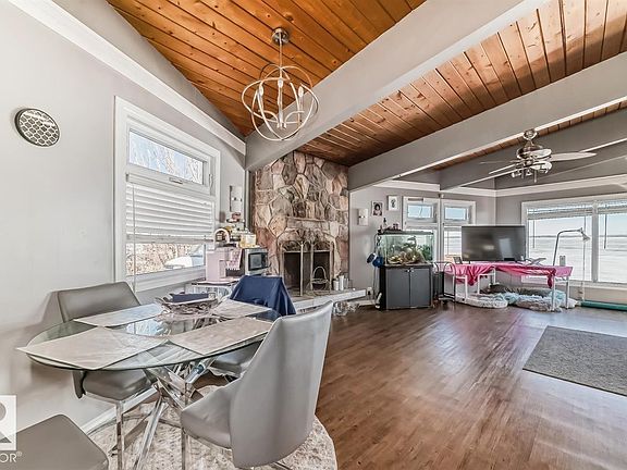 UPGRADEDED CEDAR VAULTED CEILING 1200 SQ/Ft 2 BEDROOM BUNGALOW YOU CAN ENJOY YEAR ROUND! AMAZING WATERFRONT VIEWS. OPEN CONCEPT LIVING ROOM WITH AN AMAZING STONE WALL WOOD BURNING FIREPLACE, DINING ROOM, WITH PATIO DOORS TO A NEWER DECK. LAMINATE FLOORING THROUGH OUT. 4 PCE BATHROOM WITH JACUZZI TUB! FENCED YARD, WITH LARGE STORAGE SHED, AND PLENTY OF PARKING ROOM TO PARK AN RV. UPGRADES INCLUDE NEW WINDOWS, NEW SIDING, NEW METAL ROOF, AND NEW BATHROOM. NEW HOT WATER SYSTEM. LOCATED AT THE VERY END OF THE QUIET COMMUNITY OF VAL QUENTIN, OFF THE SHORES OF LAC STE ANNE, AND DIRECTLY BESIDE IS MUNICIPAL RESERVE FOR ADDED PRIVACY. THE DOCK IS INCLUDED. AMAZING SUNSETS AND BACK YARD FIRE PITS AWAITS AT YOUR HOME AT THE LAKE! GOLF NEARBY, SCHOOL IS SUPER CLOSE TO GAS STATION, GROCERY STORE, LIBRARY DRUG STORE, BANK, PUB AND MUCH MORE! 40 MINUTES TO WEST EDMONTON, CLOSER TO STONY PLAIN AND SPRUCE GROVE AND SUPER CLOSE TO ONOWAY. YOU WILL LOVE THE SANDY BEACHES AT ALBERTA BEACH!!