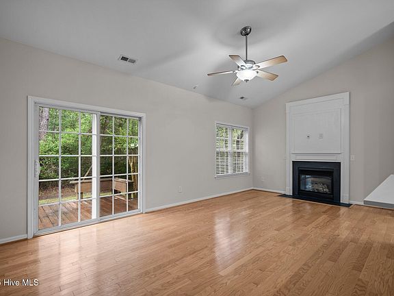 This beautifully maintained and thoughtfully upgraded 3 bedroom, 2 full bathroom home offers 1,322 sq ft and a 2-car garage less than 5 miles from Carolina Beach. Enjoy rare privacy with protected land owned by the HOA and NC Coastal Land Trust behind the home, plus a community easement on the side—meaning no neighbors will build behind or next to you. Step inside to fresh 2025 upgrades throughout: removal of popcorn ceilings, new paint from top to bottom (including ceilings and trim), brand-new carpet in all three bedrooms, updated light fixtures, and modern bathroom faucets. The living room is a welcoming space with hardwood floors, vaulted ceilings, and a beautiful gas fireplace with custom craftsman trim. The kitchen is equal parts functional and inviting with a sunny breakfast nook, pantry, Quartz countertops (2025), stainless steel appliances (2020), new microwave (2025), a new deep-basin sink and faucet, and a spacious bar overhang—perfect for meal prep or casual conversation. The primary suite is a peaceful retreat with vaulted ceilings, a walk-in closet, and private en suite bath. Outside, unwind around the firepit, fire up the grill on the raised deck with built-in seating, and enjoy added privacy provided by mature trees that create a natural screen. The 2-car garage adds tons of functionality, with a built-in workspace, utility sink, and updated hardware. Additional features include a new HVAC (2025), keyless front entry, all new exterior lights, newer roof (2018), and freshly pressure-washed exterior. Lords Creek is a walkable neighborhood with a trail to Veterans Park and local schools, plus community events throughout the year. Inlet Watch Marina is just down the road for weekend boat trips on the Intracoastal Waterway. Move-in ready, lovingly upgraded, and located in one of Wilmington's best communities—this is coastal Carolina done right. Call today to make it yours!