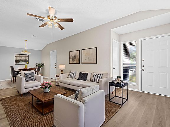 Welcome to this inviting one-story, three-bedroom, two-bath home offering a functional layout and comfortable living. Upon entry, you’re greeted by an open floor plan that seamlessly connects the kitchen, living, and dining areas. The spacious living room offers easy access to the side yard and flows naturally into the dining space, while the kitchen provides ample cabinetry for storage and meal prep. The primary bedroom features generous space, a closet, and an ensuite bath with a tub and shower combo. Two additional bedrooms are equally spacious and share a full bathroom with a similar setup. A dedicated in-house laundry room adds everyday convenience. Outside, enjoy a fenced side and backyard—perfect for outdoor activities or relaxation. A two-car garage provides secure parking and extra storage. This home offers a great blend of simplicity, functionality, and comfort.
