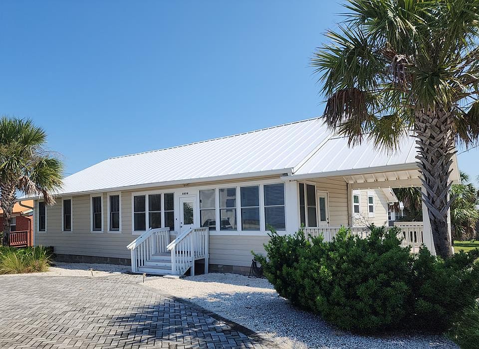 Step into timeless charm with this beautifully renovated 3-bedroom, 1-bath coastal home, originally built in the 1950s and fully updated in 2019. Nestled on a spacious 0.32-acre lot just steps from the beach with an unobstructed and protected dedicated beach view. This inviting property offers a rare blend of historic character and modern comfort. Enjoy stunning, protected Gulf views and breathtaking sunsets from the enclosed front porch...the perfect spot to unwind after a day in the sun. An open side porch is ideal for entertaining and enjoying the warm Gulf Breeze. The gorgeous white sand beaches and clear Gulf waters are an easy stroll across the street, mere steps away. Inside, you'll find original tongue-and-groove walls and beautifully preserved wood floors that add warmth and authenticity throughout. The cozy living area features a classic fireplace—perfect for cooler coastal evenings—while the renovated kitchen and bath bring in a fresh, modern style. Whether you are seeking a full-time residence, vacation getaway, or investment opportunity, this home delivers laid-back beach living with vintage charm and room to grow. The large lot offers ample space for outdoor entertaining, gardening, a pool, or even future expansion or development. A large custom-pavered circular drive is an inviting entrance to this one-of-a-kind home. Don't miss your chance to own a piece of Old Florida—all the charm but updated for today, just steps from the Gulf!