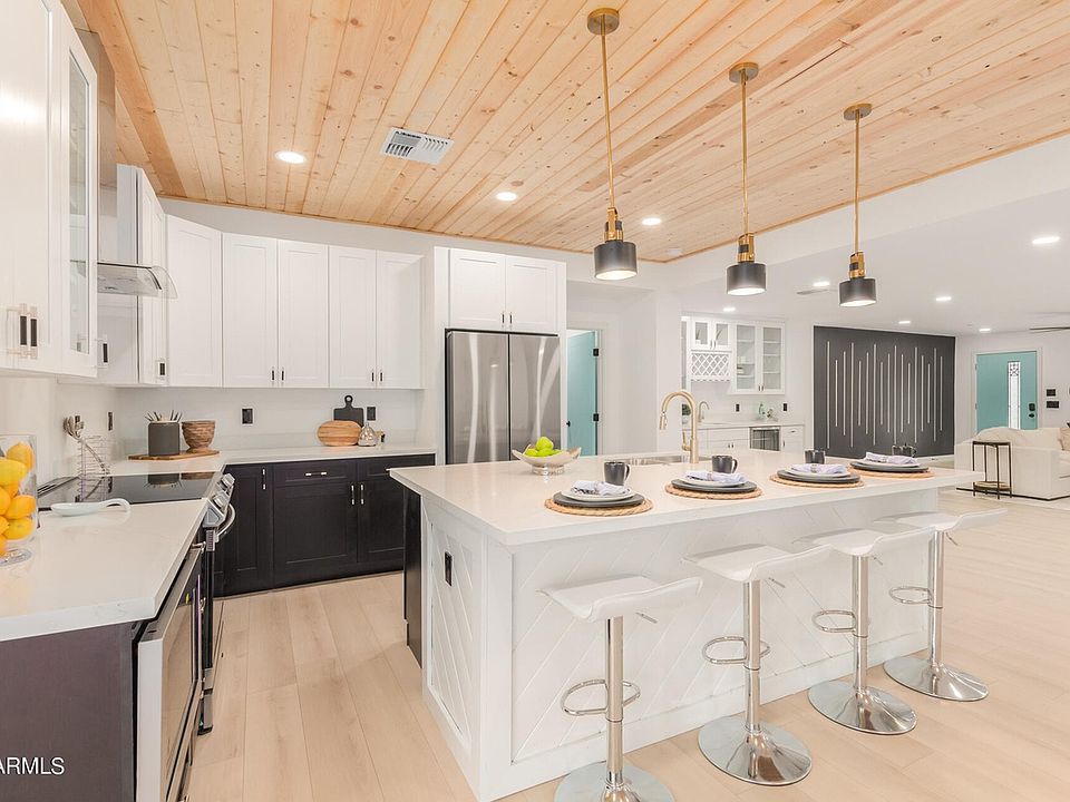 Step into an open, light-filled floor plan with soaring ceilings, oversized windows, and a gourmet kitchen that's perfect for entertaining. Featuring a large island, sleek quartz countertops, stainless steel appliances, this kitchen is a chef's paradise.