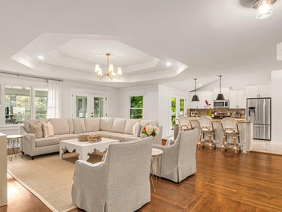 Open concept livingConditioned sunroomLarge private backyardDining areaFlat walkable neighborhoodKitchen islandMultiple decks