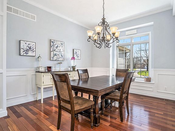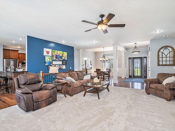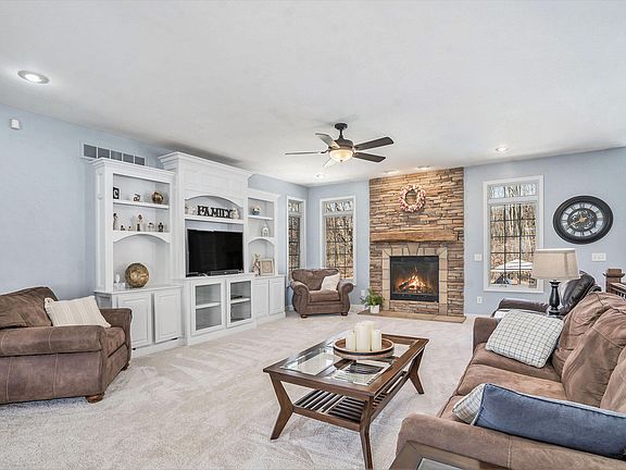 Live the resort lifestyle every day with your own 38' x 16' in-ground pool, hot tub, and spacious outdoor entertaining area, all enclosed by a beautiful wrought iron safety fence. This stunning executive walkout ranch features 4 bedrooms, 3.5 baths, and a smart split-wing floorplan centered around a dramatic floor-to-ceiling gas fireplace in the living room. A dedicated office/den with French doors offers the perfect work-from-home space—or a potential 5th bedroom. The chef's kitchen includes rich cherry cabinetry, granite countertops, a breakfast bar, pantry, plus access to the deck overlooking the peaceful pool. The primary suite boasts a luxurious, spa-like bath with a brand-new soaking tub, tiled shower, updated ceramic tile flooring, and a custom walk-in closet with solid wood organizers. Two spacious additional bedrooms are complemented by a well-appointed hall bathroom featuring a dual vanity and a separate shower area for added convenience and privacy. A main floor laundry/mudroom is conveniently located near the oversized 3-car garage. Downstairs, enjoy a sprawling rec room, cozy second living area with fireplace, and a full bar/kitchenetteplus a guest bedroom and full bath, ideal for hosting or multi-generational living. The walkout leads to a patio and grill area, and an Amish-built storage shed provides off-season storage for pool and patio furnishings. A true entertainer's dream, move-in ready and designed for comfort, style, and fun!
