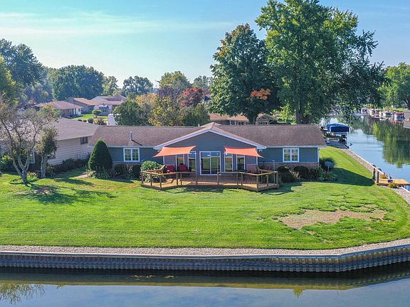 This two-bedroom, two-bath, 1,300-square-foot ranch home stands on a .278-acre grassy, level corner of all-sports Juno Lake and a tranquil channel with 275 feet of waterfront, a private dock, and spectacular nature views. Inside, the living area has a vaulted ceiling and access to a large deck for relaxing and entertaining. The kitchen has an island with bar seating, a passthrough to the living area, and exterior access. A primary bedroom has panoramic views and an ensuite primary bath. The house includes another bedroom, another bath, and a laundry/utility closet. The property includes a two-car attached garage and plenty of off-street parking. Juno Lake is part of a 515-acre chain of all-sports lakes where half the land is permanent natural wetlands, 25 minutes from Notre Dame.