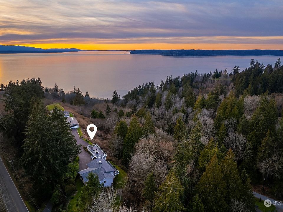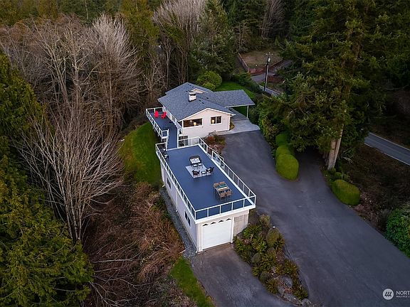 Breathtaking Golden Sunsets looking West over the Puget Sound & snowcapped Olympic Mountain range from your living room/kitchen wall of windows. This home is truly [MOVE IN READY] with newly refinished custom hardwood flooring throughout. Beautifully renovated kitchen featuring American Cherry custom cabinets with center island & open floor plan. 3BDS, 1.75BTH [PRIMARY ON MAIN]. Walk out through atrium doors onto your view deck perfect for summer BBQ’s, rooftop gardening or relaxing with a good book. New heat pump w AC, new furnace, new 50 year roof, new gutters, new oven, microwave/convection. Rooftop deck features 180 degree views over top a Gigantic Shop worthy of a car aficionado, mechanic &/or contractor. Pre-inspected