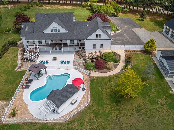 UPGRADES GALORE in this stunning private oasis located just 14 miles from Lake Anna on 7+ acres, NO HOA and whole house generator. This property is perfect for those who love the outdoors as it features a country wrap around front porch, a beautiful freeform pool, large rear patio, balcony, pool house w/ electric, gazebo, pavilion, and even a 1+-acre pond and koi pond. Roof 2019 and new siding. As you enter the home, you'll be greeted by a spacious great room with a cozy gas fireplace with custom built ins, 6 automatic power shades with 3 remotes and freshly painted walls. The kitchen boasts marble counters, stainless steel appliances (induction cook top & cafe double oven), a large island, pantry and even a trash compactor. The home boasts a main level private quarters with vaulted ceilings and it's own bathroom featuring a double vanity, quartz tops, a glass walk-in oversized shower and a skylight. The hardwood floors throughout the home give it an elegant touch. Main level also includes DR with custom trim and oversized upgraded laundry room with counter space, sink and cabinets. The gym is over 500 sq ft with separate entrance and it's own mini split with an office/studio located off of it and it's very own 100 amp panel box. Home includes 2 other 200 amp panel boxes, 2 tankless water heaters and 1 electric water heater, full house humidifier. Upstairs has 2 additional br's, full bath and catwalk over looking 2 story great room. Downstairs you'll find the perfect entertaining area to include a custom panel wall, FR, game area, a large wet bar area with quartz tops, a mounted 55" TV, 2 beverage coolers, 2 additional BR's (1 NTC), full bath, enormous craft room with numerous cabinets, island with granite tops and a full size refrigerator. Located just 11 miles from shopping and 5 miles from Interstate 95, this property offers both convenience and luxury. Whether you are looking for a peaceful retreat or an entertainer's paradise, this property has it all. Two detached garages - 1 is three car custom made with upgraded doors, cabinets, granite tops, recess lights and a second level for additional storage, #2 is one car separate for your lawn toys. Plenty of additional parking for RV, boat, etc. (50 amp RV electric hook up at parking pad). Don't miss out on the opportunity to make this gorgeous property your dream home. Schedule your showing today! TRULY A MUST SEE!