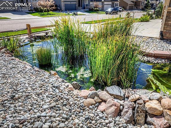 Maple treesBlue and norwegian spruceWalk in pantryWeeping sprucesBlack appliancesCovered rear patioFront yard water feature