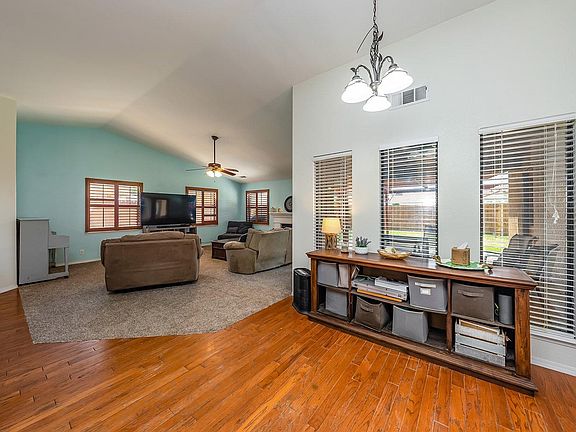With hardwood flooring and an open floor plan, this Lemoore home is ready for sale! Fantastic updates include fresh interior paint, new carpet, flooring, updated fixtures, appliances and a completely remodeled bathroom! You'll love the plantation shutters throughout as natural light beams through. A central fireplace in the living room is perfectly complimented by vaulted ceilings. Kitchen with updated appliances flows perfectly into the living room with a nice center island and large walk in pantry. Down the hall, spacious bedrooms await, and a completely remodeled bathroom is sure to impress. The magnificent owners suite features a stunning dual sided fireplace and a personal library with built in shelving. Backyard is nicely landscaped with a covered patio and extended cement. Located in a quiet cul-de-sac in a desirable Lemoore neighborhood close to the 198 freeway, you'll want to schedule your showing today!