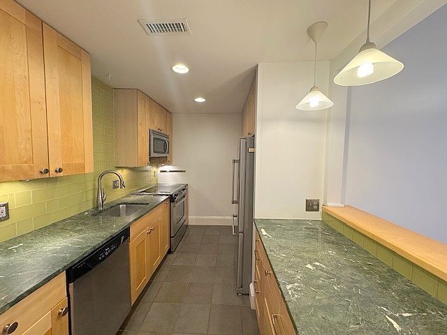 Towards the rear of the apartment you will find a stylishly renovated bathroom with marble subway tile in the shower, pedestal sink, linen closet, and nice finishes and fixtures.