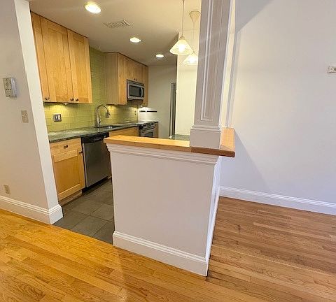 This unit is located on a raised first floor with bay windows overlooking Mass Ave. The unit has loads of incredible features, blending new updates along with preserved historic charm. The apartment has a renovated kitchen and bath, central AC, laundry in unit, and a private deck.
