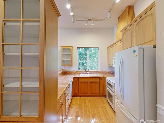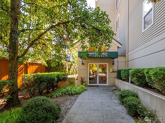 Quality top-floor end unit at desired Waterford Square across from Rhododendron Park and Kenmore Senior Center with Inglewood Golf Course, Kenmore boat launch, and Burke Gilman Trail super close by. Open light and bright floorplan features large living room with gas fireplace, 9' ceilings with fans, 2 bedrooms including spacious primary suite, 3/4 bath and walk-in closet, stackable W/D and covered deck. New carpet throughout. Extra large individual storage closet in hallway and two assigned parking stalls (one in secure garage and one outside). Well-behaved pets are allowed—only 21 units in this complex. Building completely re-plumbed in PEX.