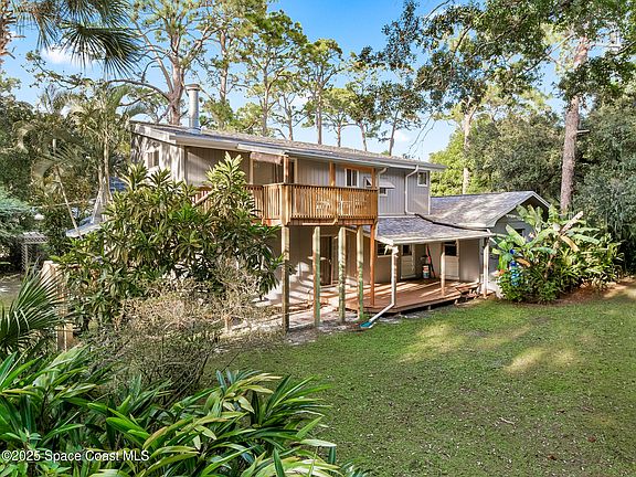 Nestled in the heart of historic Melbourne Village, this charming 4-bed, 2-bath home blends mid-century character with thoughtful modern updates. Set on a lush 0.58-acre lot, the property is surrounded by mature landscaping, nature trails, and a peaceful community known for its park-like setting and no-HOA lifestyle. Built in 1948, the home retains its original warmth with hardwood floors, tongue-and-groove ceilings, and exposed wood beams, complemented by a remodeled kitchen (2021) featuring quartz countertops and updated appliances. Upstairs, the expansive primary suite spans the entire second floor and includes a wood-burning fireplace, walk-in closet, and ensuite bath. Step outside to your newly rebuilt deck, complete with a new exterior staircase — the perfect spot to enjoy tree-top views and Florida breezes. The grounds are truly special, with many varieties of mature fruit trees, an artesian-fed koi pond with waterfall, chicken coop, a Gardeners paradise! NO cast Iron Pipes!