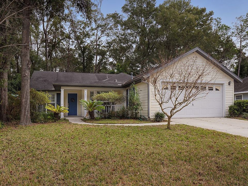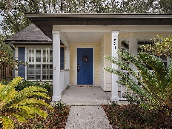 Everything you're looking for is featured in this home. Move-in ready, split feature 3 bedroom, 2 bath situated on a quiet cul-de-sac in the award-winning Mentone subdivision. An open concept floor plan boasts a large great room, kitchen and kitchenette with plantation shutters. Great room has a bonus of installed surround sound speakers and has access to a screened-in and tiled lanai with ceiling fan. A separate dining room allows for dual use as a formal eating area, or can be easily repurposed as an office space. The spacious master suite is located on one side of the house with walk-on closet and en suite, which features double vanity, whirlpool tub, and separate shower. Two generously sized bedrooms are situated on the opposite side of the home, along with a full bath and laundry room. Two car garage comes with shelving for easy storage and organization. Exterior of Hardi-plank and wood beautifully decorated by lush landscape. Fully fenced spacious back yard with a concrete deck and cedar playhouse. Mentone features well-kept neighborhood pool, a playground, along with basketball, volleyball, tennis courts, a soccer field, and jogging trail. Zoned for an excellent school district including Wiles and Kanapaha. Winding streets help keep traffic speed safe. Easy access to work, schools, play and I-75.Close to UF Schools and UF hospitals. Zoned for an excellent school district including Wiles and Kanapaha. Winding streets help keep traffic speed safe.