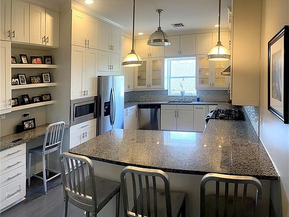 Ample custom cabinetryStainless steel appliancesIntricate medallionsGranite countertopsBright and inviting denGenerously sized bathroomStately coffered beamed ceilings