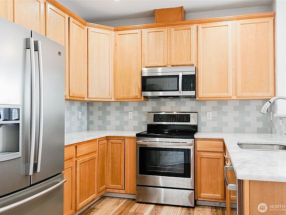 This bright and spacious 2-bed, 2-bath townhouse (1,140 sq ft) features an open floor plan with laminate wood-style flooring throughout. Relax in the cozy living area with a fireplace or step out onto the balcony. The primary suite offers a walk-in closet, a linen closet, and a private bath, while the 2nd bedroom is near the 2nd full bathroom. A dual-purpose laundry room doubles as a pantry. Parking includes 1 car garage plus space for 2 more vehicles (driveway/street). Recent updates include a new roof, the home has high ceilings with no carpet for easy maintenance. Enjoy a prime location near the Interurban Trail, I-5, Sounder Train stations, hospitals and community amenities—just a mile from Fife Elementary, Middle & High Schools.