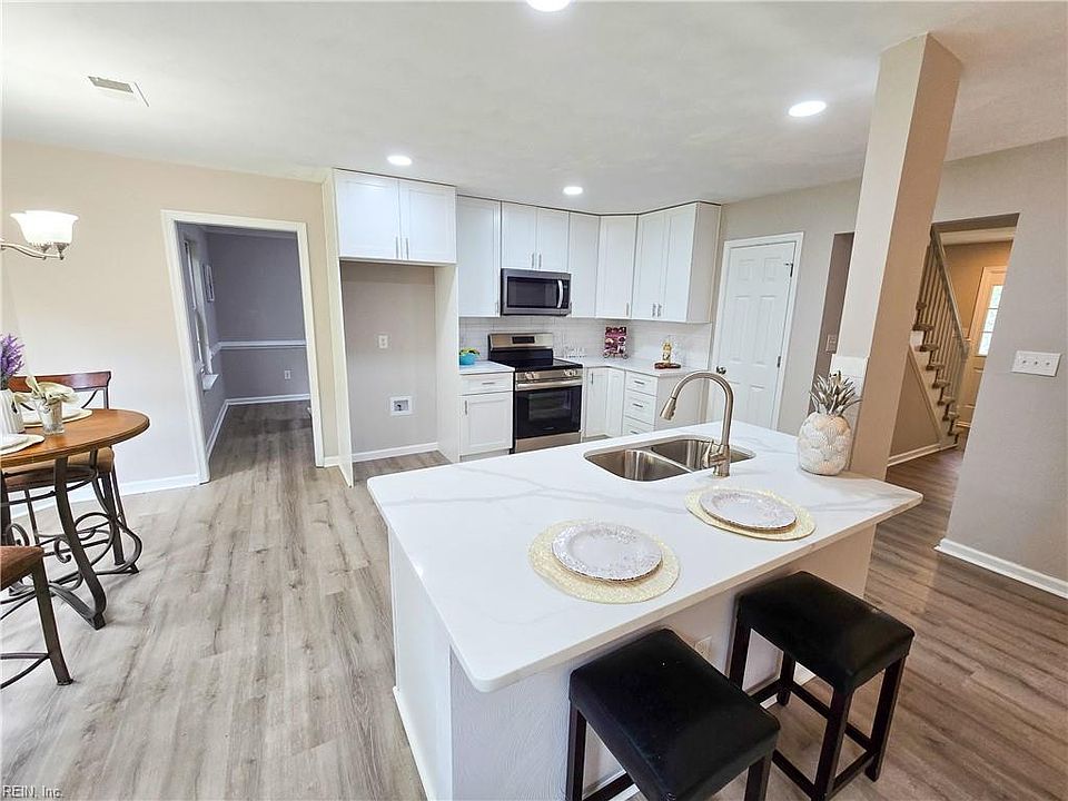 Welcome to this spacious, upgraded 4-bedroom, 2.5-bathroom home featuring multiple living areas—including a formal dining room and cozy family room—perfect for both everyday living and entertaining. Step into the brand-new eat-in kitchen showcasing soft-close shaker cabinets, quartz countertops, stainless steel appliances, and a custom tile backsplash. The large primary suite offers vaulted ceilings, three closets (including a walk-in), and a beautifully updated en-suite bathroom with dual vanities. Fresh paint throughout, plush new carpet, and luxury vinyl plank flooring. All bathrooms have been fully renovated with modern vanities and new toilets. Step outside to a spacious fully fenced backyard with a deck ideal for outdoor gatherings. A new roof adds to your peace of mind. Located in the desirable Burbage Grant community with access to nature trails, tennis courts, playgrounds, a clubhouse, a pool, and just minutes from highways, military bases, dining, and entertainment.