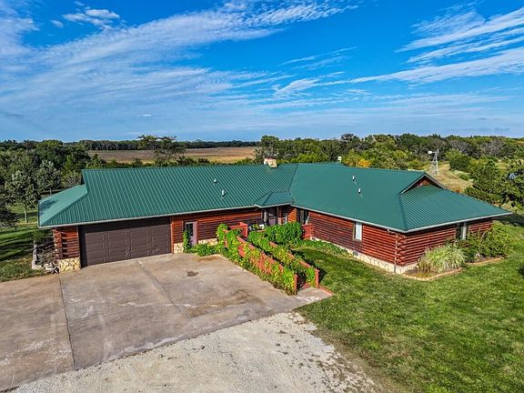 PROPERTY DESCRIPTION: Rock Creek Lodge consists of a beautiful 5 bedroom 4 bath log home and building on 13.9 acres north of Towanda in Butler County, Kansas. The main level consists of 2471 square feet. High quality upgrades exist throughout the house that include custom alder wood kitchen cabinets, black stainless steel Kitchen Aid appliances, granite countertops in the kitchen and bathrooms, hickory hardwood floors throughout the main level, and custom alder wood doors and closet doors. The main floor and the basement each have a double sided wood burning insert fireplace. Walkout basement features include a living room area, 2 bedrooms, bathroom, and a bonus area that could serve a multitude of uses! There is an oversized 2 car attached garage. The log home and building are currently utilized as a place for individuals with disabilities to work?, ?learn?, ?and grow in the natural beauty of a rural?, farm-setting in Butler County, ?KS?. Programs at Rock Creek teach life?, ?social?, ?and job skills through hands-on activities like animal care?, ?gardening?, ?arts?, ?cooking?, ?events?, classes?, ?and more?. The property was formerly a successful functioning venue for weddings and events. You will absolutely love the building with almost 5000 total square feet of event space, high end kitchen, mens and women’s bathrooms, office space and storage. In addition to excellent fishing, the 3 stocked ponds offer endless enjoyment and add to the great views! You will not be disappointed by the comfort and enjoyment sitting on the HUGE covered wraparound deck! ADDITIONAL FEATURES: A large variety of quality trees are growing and thriving on the property including apple, pear, walnut, chestnut, and oak. There are sand plums and grape vines as well. This rural setting is a tremendous opportunity to enjoy quiet and quality living! Soak in the fresh air, soft sounds, wildlife and nature daily! FORMER VENUE: As previously mentioned, the former venue space is almost 5000 square feet including the building and storage area. In addition to a large space for tables and a dance floor, there is a built in kitchen/bar as well as his and hers bathrooms. A covered patio extends around a large portion of 2 sides of the building allowing outside seating areas.