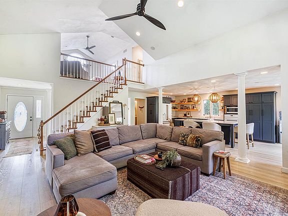 Enjoy autumn sunsets and peaceful country views from this stunning home on the edge of town, set on 1.19 acres. An impressive entry opens to a wall of windows, vaulted ceilings, and a two-way fireplace overlooking the private, tree-lined backyard. The recently renovated dream kitchen shines with modern finishes. Spacious primary suite offers a beautifully updated bath, walk-in closet, and tray ceiling. A loft area features a second bedroom and full bath, perfect for guests or an office. The finished lower level includes garage access and an additional family room. Step outside to a composite deck and private patio ideal for outdoor entertaining. Your next chapter starts here!