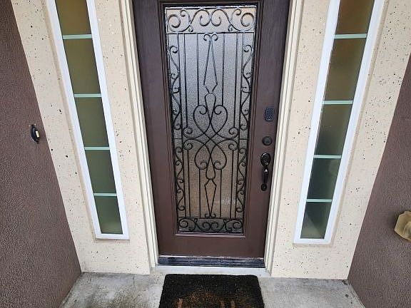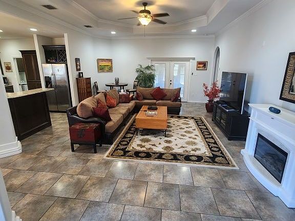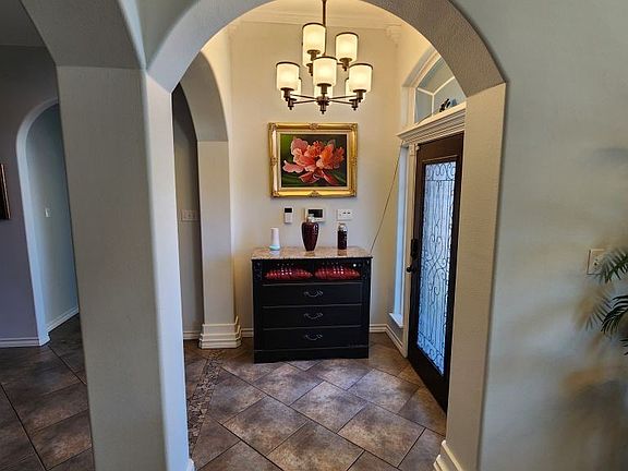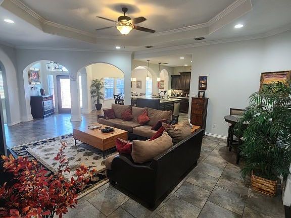 A very nice home! In a pleasant neighborhood and approx .1 mile from major streets or intersections. A great floor plan, with an open space living area (living room, kitchen, and dining room), and the Master bedroom and spare bedrooms are separated. Granite countertops in the kitchen and 2 Full bathrooms, and Large flooring tiles in the open living area, bathrooms, and laundry. Carpet in the bedrooms and closets. The back patio, with 2 opening French doors, was enclosed recently in 2022 with a 3rd glass door and 2 windows facing the backyard. Recessed, tray ceilings with crown molding in MBR and living area, and vaulted ceiling in the front entry way. Interior features archways and pillars, custom cabinets, Large accented floor boards, accented doors, and blinds. Newer electric stove & range in 2025. Two rock pitted, concrete driveways, with a circular in the front, and a garage in the back. Landscaped front and back. Entire house is electric, no gas. SimpliSafe alarm.