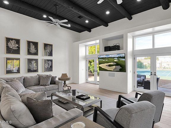Luxury retreat in the heart of Paradise Valley AZ. Stunning 5 bedroom, 4.5 bath estate with resort-style backyard on over 1 acre with private pool, pickleball, tennis & basketball court, horse stables coral, patios, outdoor shower, pool bath, workout room, built in BBQ & 20 citrus trees. Entertainers dream with expansive great room, seated bar & sitting room. & formal dining room. Chef's kitchen boasts top of the line appliances, custom cabinetry, spacious island with seating for 6, & dining table next to cozy fireplace and TV. Primary bedroom overlooks pool and is attached to gym. 2 additional primary bedrooms with walk in closets, en-suite baths and separate exits. 4th bedroom- 2 queens, 5th bedroom- king bed, & an office with closet and trundle bed. $20k June-October. $25k Nov-May