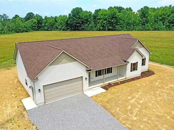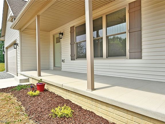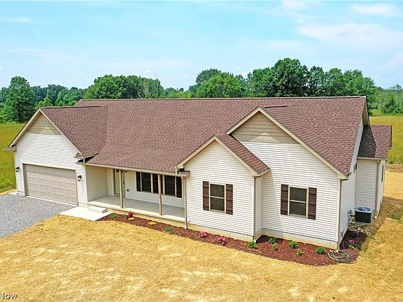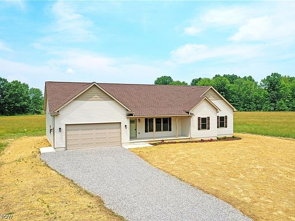 Kick off your summer with this smoking hot, new Lordstown school district construction! Set in a scenic, semi-rural landscape with two parcels totaling nearly 5 acres, this handsome home quickly stands out with its clean, earth toned color scheme and sizeable, covered front patio. Step inside to find a welcoming, naturally lit living room that takes full advantage of its three large picture windows. Hardwood styled flooring runs underfoot while bright white accents trim the baseboards and window casings. The tall ceilings continue throughout the residence for an impressive visual feel while a prominent central combined kitchen and dining room continues the theme with an airy, open layout. Decorative lighting shines down from above as you take in kitchen with its sleek glass tiled backsplash and granite countertops that run between bright stainless work and modern cabinetry. Sliding glass doors offer sunshine drenched meals at the dining portion. At the far end, the garage entry showcases the oversized two car layout with bonus rear workshop and basement walkout. Down the main hall, first floor laundry accompanies a trio of impressive bedrooms along with an elegant full bath. The larger master suite contains its own full private bath with soaking tub, stall shower and walk-in closet. Downstairs, a full basement highlights its stamped wall treatment with stained concrete floors and high efficiency, all electric service.
