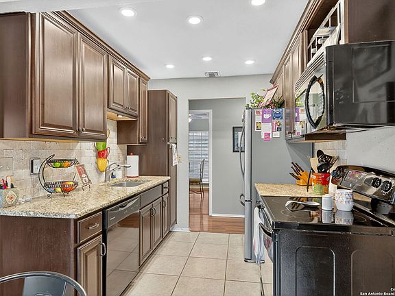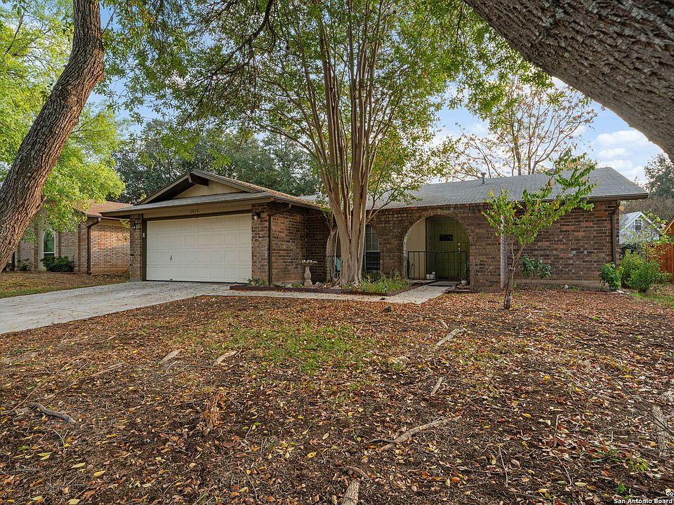 Set in the convenient Medical Center area of northwest San Antonio, this single-story home at 6835 Hogans Trail blends thoughtful updates with a relaxed everyday feel. The living room offers a vaulted ceiling with an exposed beam and a brick fireplace that adds warmth and character. The kitchen features granite countertops, tumbled-stone backsplash, recessed lighting, upgraded fixtures, and a clear view toward the backyard through French doors. All rooms throughout the home include updated light fixtures, giving each space a clean, refreshed look. Bedrooms have updated flooring, and both bathrooms are well-maintained, including an updated vanity in the primary suite. The home also includes a newer water heater and a newer garage door opener for added peace of mind. Outside, the covered patio and pergola-style setting with string lights create a comfortable place to unwind. The fenced backyard sits on an approximate 7,405 sq ft lot with mature trees that offer shade and privacy. A two-car garage and a full-size laundry room add practicality to the layout. The location offers quick access to major local destinations: roughly 5 minutes to Methodist Hospital, 7 minutes to University Hospital, 8 minutes to H-E-B, and about 10 minutes to Loop 1604 or I-10. Schools include Leon Valley Elementary (about 1.0 mi), Rudder Middle School (about 1.6 mi), and Marshall High School (about 0.4 mi). Dining, parks, grocery options, and everyday services are all nearby, making daily errands simple and convenient. With its upgrades, generous yard, and close-in Medical Center location, this home offers comfort, convenience, and an inviting layout in one of San Antonio's most accessible areas.
