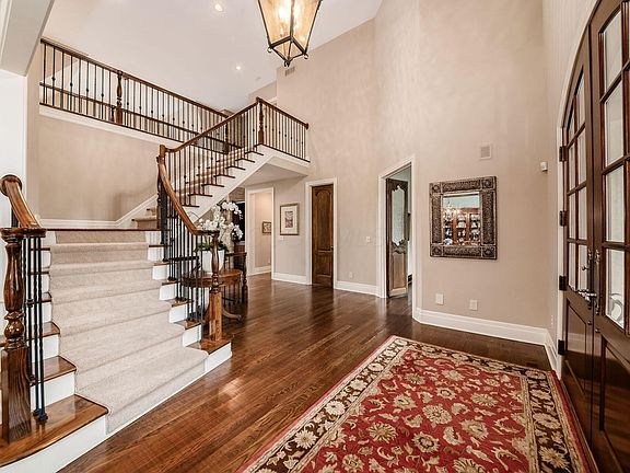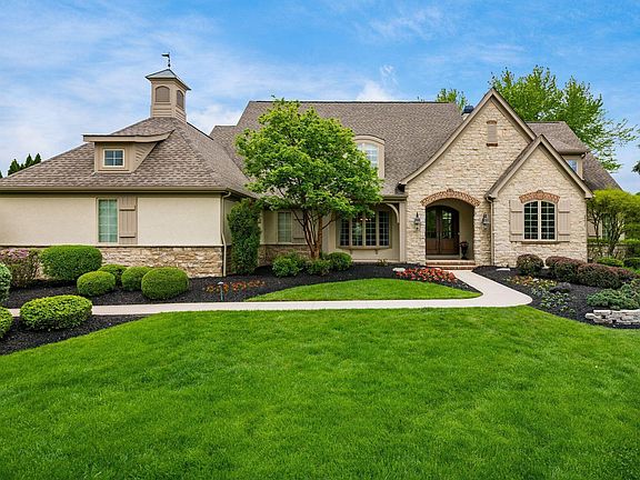 You will love all the details in this timeless French Country masterpiece on 1/2 acre private lot. Inside are beautiful hdwd floors, rod iron railings, a den w/ built-ins & the most charming custom doors. The vaulted great room is highlighted by the floor to ceiling stone fireplace. The chefs kitchen will please the cook in the family w/ dbl ovens, warming drawer, large center island w/ wine refrig., walk-in pantry & cozy hearth room w/ fireplace. Nice mudroom & good sized laundry rm. 2 powder baths on main level. 1st floor primary suite w/ large walk-in closet. All 3 upstairs bdrms have ensuite bathrooms. Bonus playroom btw bdrms. Lower level rec room, bar w/ brick wall, bdrm/bath. Outside covered patio is an entertainers dream. Brick fireplace w/ tv, huge patio areas & plenty of green space.