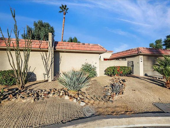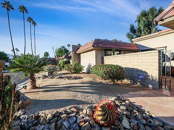 Completely reimagined and impeccably upgraded, this extensively customized condo offers an outstandinglocation in the heart of Cathedral City's gated Cathedral Canyon Country Club. Located at the end ofan intimate cul-de-sac, the single-level design is ready for move-in and features a gated entry courtyard withbeautiful mountain views, creating the ideal spot for morning coffee. An expansive wraparound back patioborders the lush fairways of the community's 18-hole golf course and embraces vast vistas of rolling turf anda shimmering lake. Indoors, two bedrooms, two baths, a den with courtyard access, and a custom bonusroom/office that opens to the rear patio are revealed in approximately 1,736 square feet. Walls werereconfigured to create a seamless space that enriches daily living and effortless entertaining. A custom MidCentury-inspired entry door leads to living and dining rooms that frame scenic views through windows andsliders opening to the patio. Chefs of all skill levels will appreciate an open kitchen with peninsula bar,handsome stained-wood Shaker cabinetry, solid-surface countertops, a full tile backsplash and preferredstainless steel appliances. Both bedrooms provide patio access, and the primary suite hosts frosted-glasswardrobe doors and an ensuite bath with custom walk-in shower. Recessed LED lighting, contemporarylighting fixtures and solar-tube skylights illuminate the home, while custom paint, designer floor tile, ceilingfans and plantation shutters lend upscale flair. Upgraded dual-paned sliders throughout, newer HVAC, a split AC unit inthe bonus room, and a newer roof with recent re-coat enhance energy efficiency. Outdoors, the patio andcourtyard decking was resurfaced to look like stone. The Cathedral Canyon Tennis Club and clubhouse aresteps away, and the gated enclave features countless pools, parks and pathways. This residence isperfect as a lock-and-go vacation getaway and a wonderful year-round home. Downtown Cathedral City'sshops and restaurants, Palm Springs, Rancho Mirage and Palm Desert are all within easy reach, and milesof hiking trails, scenic parks and even a surf club are moments away.