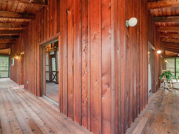 Wood and brick exteriorWraparound screened-in porchMature treesScenic wooded propertyExpansive bonus spaceCozy detailsSoaring vaulted wood-beamed ceilings